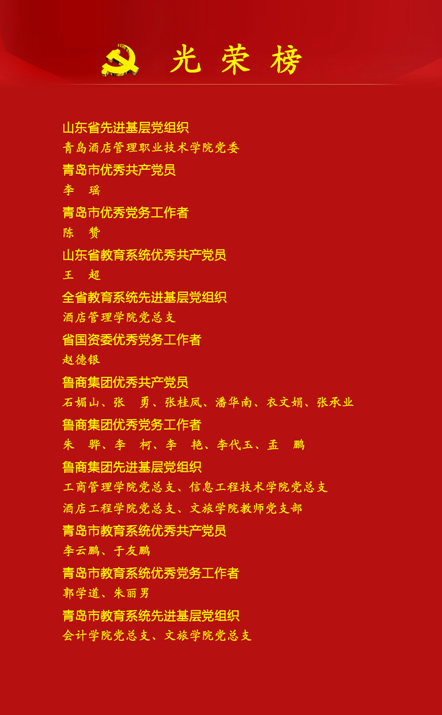 学院党委被省委授予“山东省先进基层党组织”称号;李瑶被市委授予“青岛市优秀共产党员”称号,陈赞被市委授予“青岛市优秀党务工作者”称号;王超被省委教育工委授予“山东省教育系统优秀共产党员”称号,酒店管理学院党总支被省委教育工委授予“全省教育系统先进基层党组织”称号;赵德银被省国资委党委授予“优秀党务工作者”称号;石媚山、张勇、张桂凤、潘华南、衣文娟、张承业6名同志被集团党委授予“优秀共产党员”称号,朱骅、李柯、李艳、李代玉、孟鹏5名同志被集团党委授予“优秀党务工作者”称号,工商管理学院党总支、信息工程技术学院党总支、酒店工程学院党总支、文旅学院教师党支部4个基层党组织被被集团党委授予“先进基层党组织”称号;李云鹏、于友鹏2名同志被市委教育工委授予“优秀共产党员”称号,郭学道、朱丽男2名同志被市委教育工委授予“优秀党务工作者”称号,会计学院党总支、文旅学院党总支被市委教育工委授予“先进基层党组织”称号。
