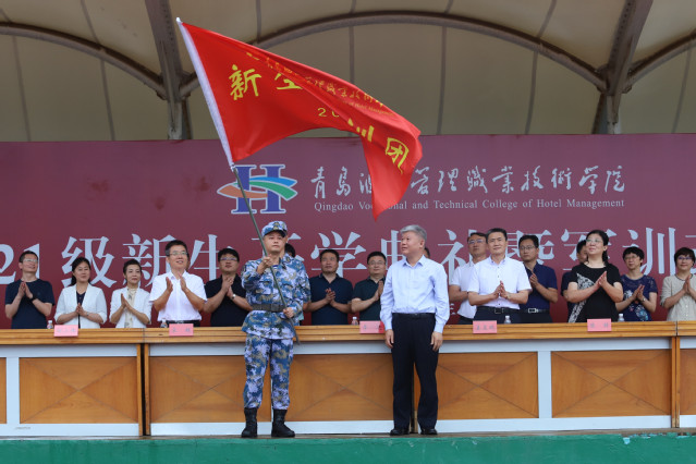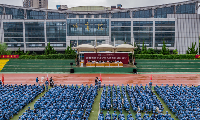 典礼现场举行了授旗仪式,学院党委书记李达向新生军训团授团旗,正式拉开了2021级新生军训的序幕。在接下来的十天时间里,同学们将进行国防法制教育、内务整理教育、军姿队列训练、思想劳动教育和文明习惯教育等军事化教育和管理。