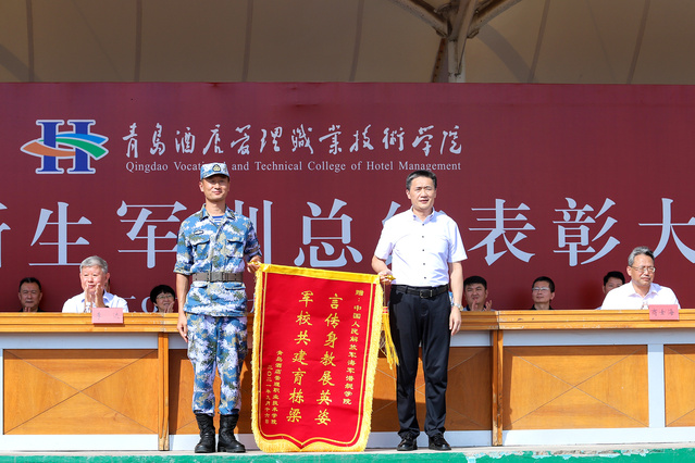 院长姜玉鹏代表学院向部队首长赠送锦旗,对承训部队给予学院新生军训工作的大力支持表示由衷感谢。