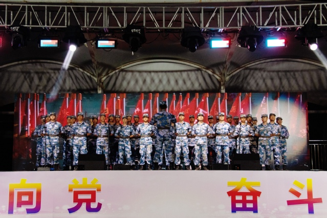 本网讯(团委 孙梦男)青春向党,奋斗强国。9月14日晚,学院2021级新生迎新晚会在体育场举办。新生军训承训部队首长、学院院长姜玉鹏与承训教官、2021级新生及辅导员一同观看晚会。