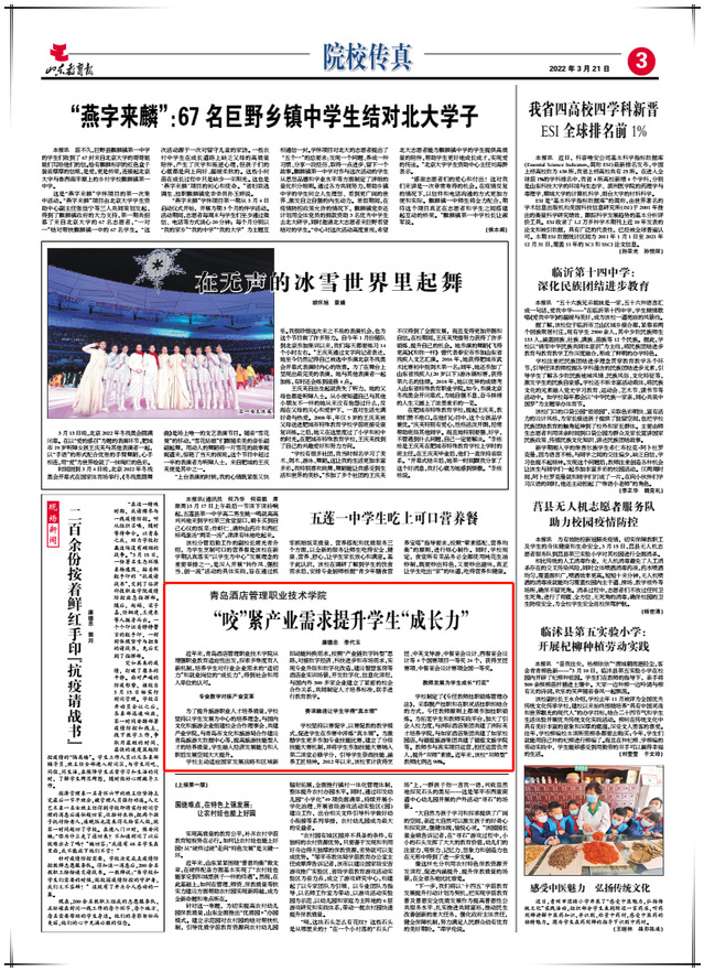 本网讯(党委宣传统战部)3月21日,《山东教育报》第三版以《青岛酒店管理职业技术学院“咬”紧产业需求提升学生“成长力”》为题,报道学校增强职业教育适应性,探索多维度育人新机制,培养学生“适切力”和“成长力”的经验做法。全文如下: