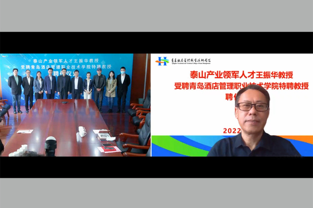 本网讯(艺术学院 袁宏强)5月5日,泰山产业领军人才、山东省人大代表、山东世博华创动漫传媒有限公司董事长王振华受聘学校特聘教授暨“王振华教授工作站”揭牌仪式在行政楼二楼会议室举行,学校院长姜玉鹏、副院长张宗国参加活动。