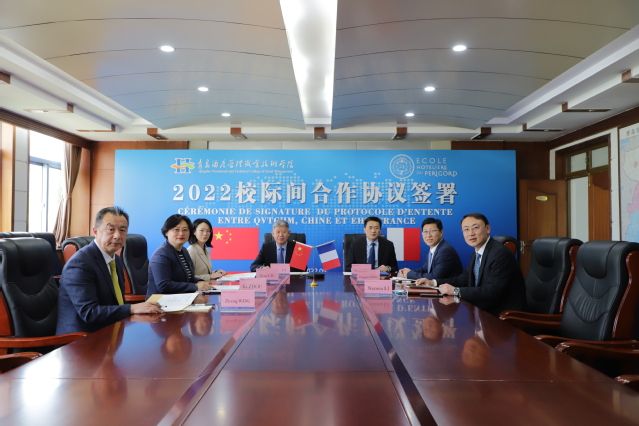 本网讯(国际交流与合作处 张晴)5月13日下午,学校在行政楼二楼会议室举行与法国佩里格酒店学院线上签约仪式。法国多尔多涅省工商会会长皮埃尔·武林、法国佩里格酒店学院院长凯西·拉努、餐饮酒店联合会主席让·吕克·布斯克,学校党委书记李达、院长姜玉鹏、副院长张宗国出席活动。