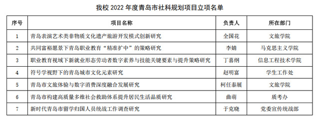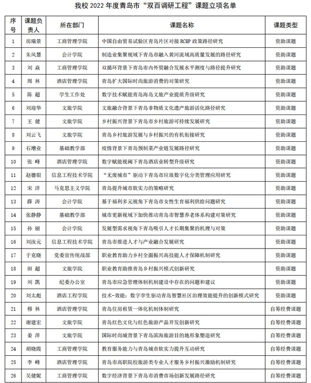 本网讯(科研发展处)近日,青岛市“双百调研工程”领导小组办公室、青岛市哲学社会科学规划管理办公室相继公布了2022年度青岛市“双百调研工程”课题、青岛市社科规划项目的立项结果,我校成功立项26项青岛市“双百调研工程”课题和7项青岛市社科规划项目,立项数在全部申报单位中均位居前列。