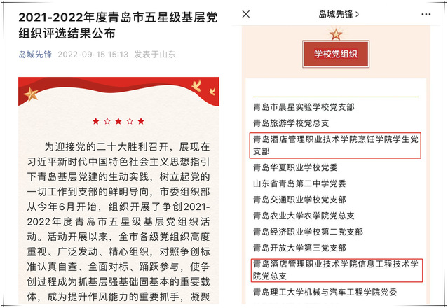 本网讯(组织人事处 吕丽)近日,青岛市委组织部公布了2021-2022年度青岛市五星级基层党组织评选结果。经层层选拔和多场书记擂台比武,我校信息工程技术学院党总支和烹饪学院学生党支部获评“青岛市五星级基层党组织”,是评选结果中唯一同时入选2个基层党组织的学校。