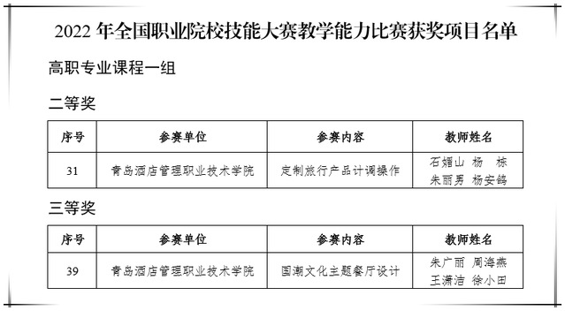 本网讯(教务处 王赵慧)近日,从全国职业院校技能大赛执行委员会传来喜讯,我校作品《定制旅行产品计调操作》《国潮文化主题餐厅设计》分别荣获全国职业院校技能大赛教学能力比赛专业(技能)课程一组二等奖、三等奖,实现新突破。