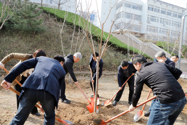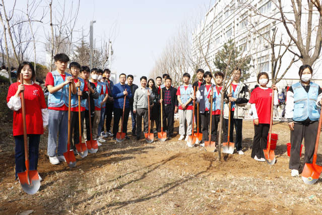 植树现场,大家挥锹扶苗培土、提水浇灌,有条不紊、相互配合,彼此交流着对美丽校园建设、绿色理念传播的建议想法,凝聚了爱绿、植绿、护绿共识,种好的一株株樱花、西府海棠,为美丽校园再添新绿。