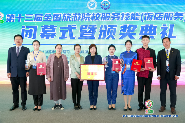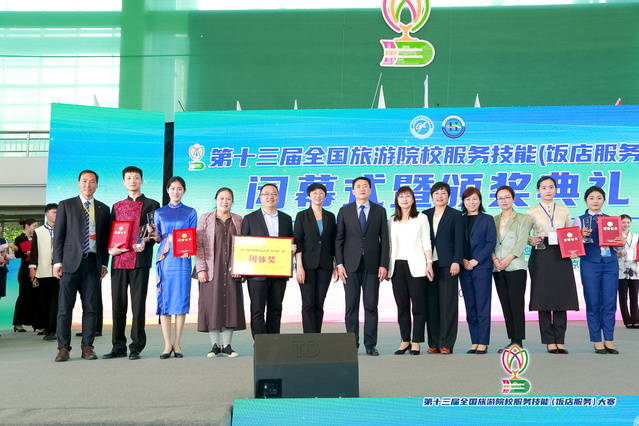 本网讯(酒店管理学院 郭贵荣)5月10日-14日,由文化和旅游部市场管理司、中国旅游协会指导,中国旅游协会旅游教育分会主办,我校承办的第十三届全国旅游院校服务技能(饭店服务)大赛圆满落幕,我校酒店管理与数字化运营专业的黄欣艳、王玮俪、赵董宇、段晓璇四名同学分获高职高专院校组中餐宴会摆台、西餐宴会摆台、客房服务和鸡尾酒调制一等奖,学校以总成绩第一名获得团体一等奖,再次实现大满贯。