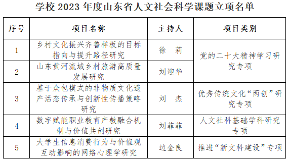 本网讯(科研发展处)近日,山东省人文社会科学课题管理办公室公布了2023年度山东省人文社会科学课题(重大招标课题、专项研究课题)立项名单,我校立项5项专项研究课题。