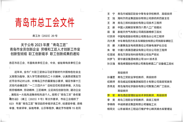 本网讯(工会 吴春雷)近日,青岛市总工会下发《关于公布2023年度“青岛工匠”青岛市全员创新企业、劳模和工匠人才创新工作室创新型班组、职工创新能手工创新成果的通知》,对“青岛工匠”等荣誉予以通报,我校烹饪学院教师李军获评“青岛工匠”。