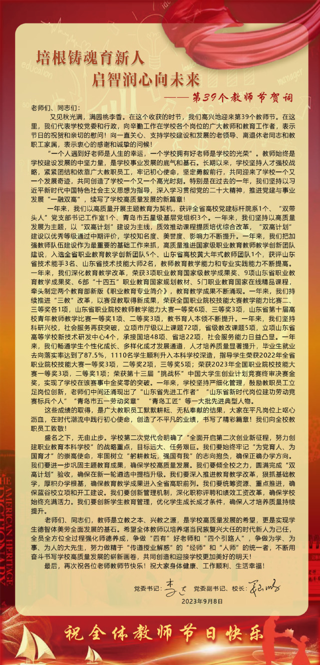 培根铸魂育新人 启智润心向未来——第39个教师节贺词