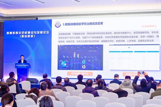 在智慧教育示范校建设与发展论坛(职业院校),张宗国以《数字赋能发展,人才领航未来》为题,从理念目标、顶层设计、保障体系、教育教学、师生素养等方面介绍了我校数字化转型的做法和智慧教育建设成果。