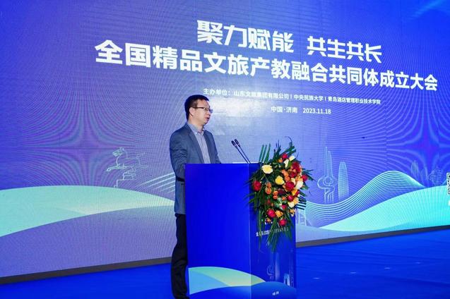 本网讯(文旅学院 周海磊)11月18日,由学校联合山东文旅集团有限公司、中央民族大学发起的全国精品文旅产教融合共同体成立大会在山东济南拉开帷幕。山东省文化和旅游厅党组成员、副厅长孙蕾,山东省人民政府国有资产监督管理委员会党委委员、副主任、财务监管处处长秦春玲,山东省教育厅职业教育处副处长郭庆志,山东文旅集团有限公司党委书记、董事长丁艺,中央民族大学校长助理韦达提·米吉提,我校党委书记李达、副校长张宗国出席大会。