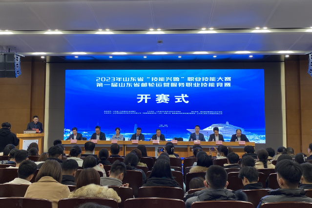 本网讯(酒店管理学院 刘菲菲)11月23日,2023年山东省“技能兴鲁”职业技能大赛第一届山东省邮轮运营服务职业技能竞赛在我校开赛。山东省对外投资与经济合作商会会长于建林,山东省人力资源发展促进会副秘书长苗庆凯,青岛国际邮轮港区服务管理局邮轮文旅部部长郝东陈,山东港口邮轮文旅集团青岛国际邮轮有限公司副总经理李月妍,中船舰客教育科技(北京)有限公司校企合作部总经理周亮,山东国信国际经济技术合作有限公司董事长孙国庆、总经理李新颖,我校校长姜玉鹏参加开赛式。开赛式由副校长张宗国主持。