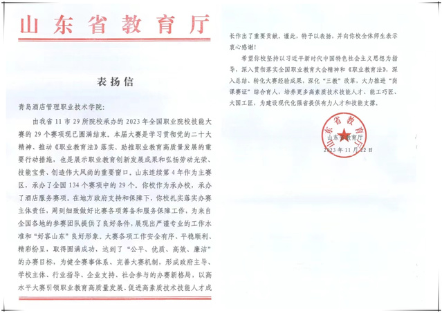 本网讯(酒店管理学院 高晴)近日,山东省教育厅发来表扬信,对学校高质量承办2023年全国职业院校技能大赛高职组“酒店服务”赛项予以表扬,对学校在办赛中所作的突出贡献表示感谢。