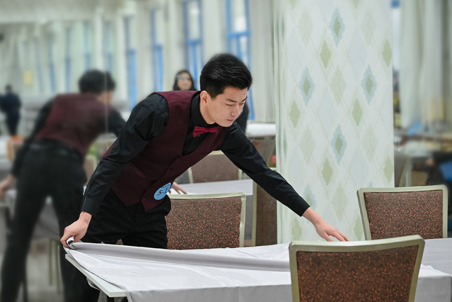 来自全市22家酒店的70余名选手分别在中餐宴会摆台、西餐宴会摆台、中式铺床和前厅接待四个赛项中展开激烈角逐。比赛内容包括现场专业技能比赛和仪容仪表展示两部分,主要考查选手操作的熟练性、规范性、创新性以及个性化服务应用与职业素养。比赛过程中,各参赛选手操作规范、技能精湛、创意新颖,充分展现了青岛市旅游饭店从业人员的精神风貌和服务水平。
