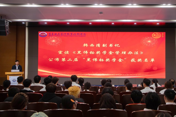 韩西清宣读《黑伟钰奖学金管理办法》和第二届“黑伟钰奖学金”获奖学生名单,并为“味来可期·一味一格”烹饪工匠礼仪展演队授旗。