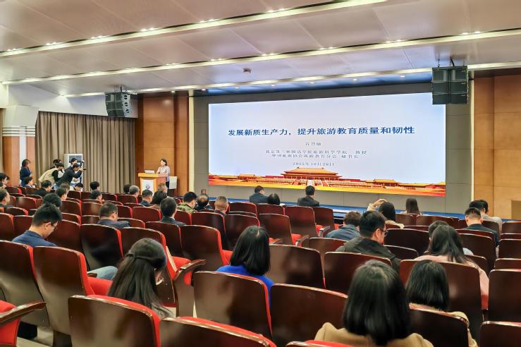 在主旨演讲环节,中国旅游协会旅游教育分会秘书长、中国旅游研究院饭店产业研究基地主任谷慧敏以《发展新质生产力,提升旅游教育质量和韧性》为题进行主旨演讲,系统阐述了新质生产力在旅游领域的实践运用。谷慧敏从国家政策引领、产业创新发展、国内外企业实践等方面系统阐述了旅游新质生产力的内涵与应用,深入分析了人工智能对旅游教育带来的冲击与挑战,并就加快数智旅游教育战略实施、优化学科专业设置、提升师生数智素养等提出了富有建设性的思考与建议。