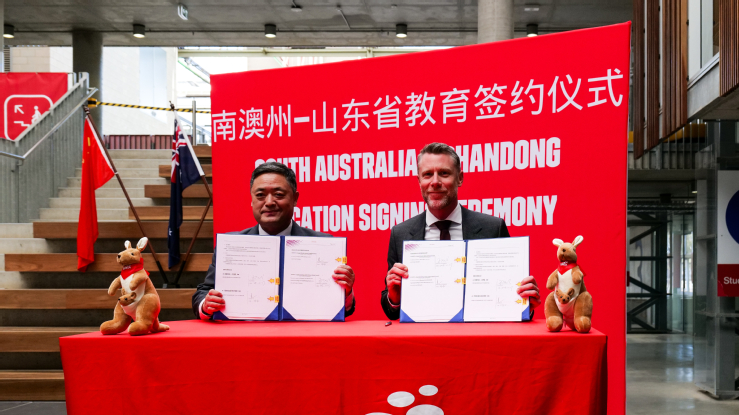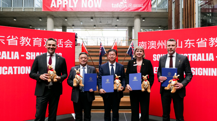 本网讯(国际交流与合作处 周莉)11月27日,澳大利亚南澳州与山东省教育对话会及签约仪式在南澳洲阿德莱德市隆重举行。本次活动由山东省教育厅、南澳州州发展部和南澳州技术与继续教育学院共同主办。山东省教育厅副厅长张志刚,南澳州教育、培训和技能部部长布莱尔·包也,南澳州技术与继续教育学院董事会主席英格丽·海索普出席会议,学校党委书记刁洪斌参加活动并签约。