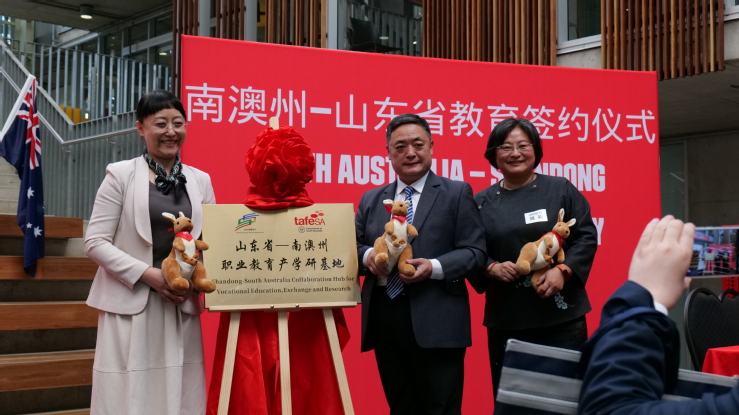 在与会嘉宾的共同见证下,张志刚代表山东省教育厅与南澳州技术与继续教育学院签署合作备忘录,并为“山东省-南澳州职业教育产学研基地”揭牌。刁洪斌代表学校与南澳州技术与继续教育学院签署第二个五年合作备忘录。我校是对话会及签约仪式中唯一签署职业教育合作备忘录的高校。
