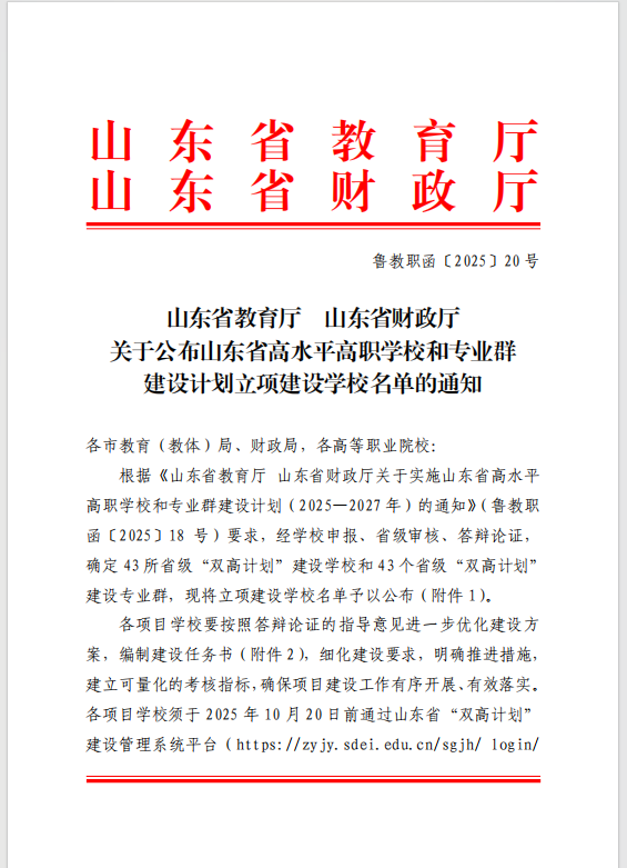 根据《山东省教育厅山东省财政厅关于公布山东省高水平高职学校和专业群建设计划立项建设学校名单的通知》(鲁教职函〔2025〕20号),学校以优异成绩入选省级“双高计划”建设学校。其中,精品旅游专业群对应“黄河流域生态保护和高质量发展”和“旅游强省”战略,紧密对接山东省十强产业精品旅游产业和“雁阵型”产业集群,基于“美景、美宿、美食”服务设计场景,深度对接企业转型升级对高端旅游产品开发与运营人才的需求,服务于青岛市世界级旅游目的地城市、国际知名滨海旅游城市建设。智能物联专业群对应“数字中国”“数字强省”战略,对接“山东省‘6997’现代化工业体系”中新一代信息技术产业,紧密对接智慧城市建设场景中智慧社区、智慧园区、智慧能源、智慧环保、智慧文旅和智慧康养六大子场景,深度服务城市高质量发展、高效能治理、高品质生活。
