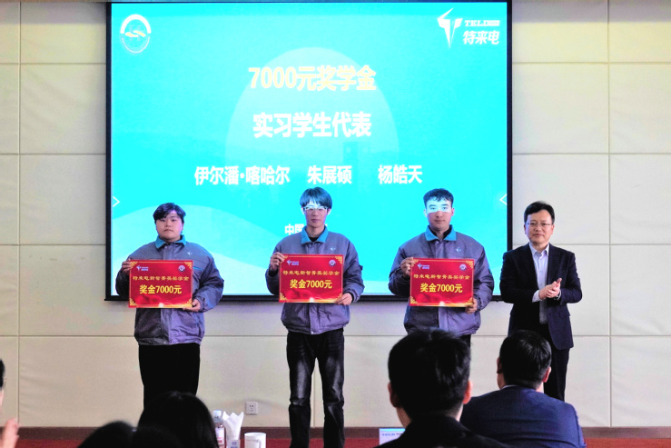 孙有彬、刘新宇、朱鑫升分别为在本次工学交替实践中表现突出的学生颁发了优秀实习生奖学金。优秀实习学生代表李文新分享了在企业岗位锻炼中的成长收获,表达了对学校培养和企业指导的感谢。